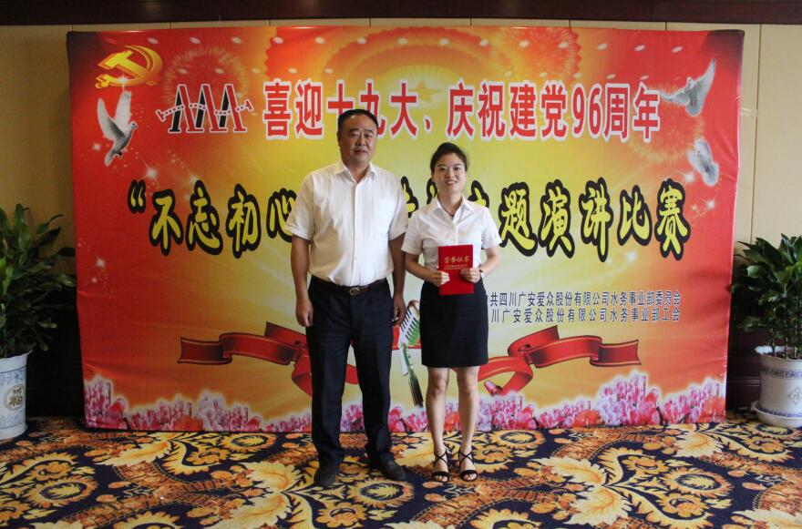 經過激烈角逐,評委們從演講材料、語言表達、形體語言、主體形象多方面綜合考量,采取現場打分的方式,評出了一等獎、二等獎、三等獎和優秀獎。來自廣安花園制水有限公司的選手陳肖依,憑借充分的準備和完美的舞臺表現,以一篇《不忘初心跟黨走-為人民服務》摘得桂冠,成為比賽的冠軍。